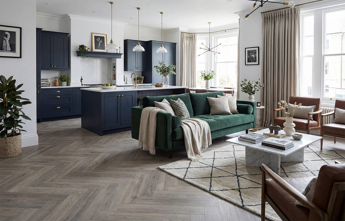 Минерально-каменный MSPC ламинат Дуб Браунстоун — прекрасный образец того, как должны выглядеть полы в рисунке «английская ёлка». Имеют сложный благородный цвет с нотками состаренности и винтажности. Дуб Браунстоун отлично сочетается с холодными оттенками белого, которые придают ему изящества, а многогранность тональности позволяет ему сочетаться с любыми видами текстиля.